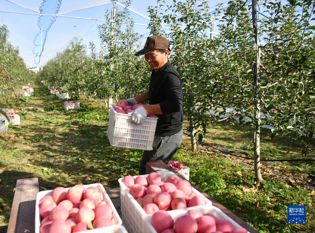 2022年10月10日,在陕西省延安市洛川县永乡镇阿寺村一处果园,果农在搬运苹果。新华社记者 张博文 摄