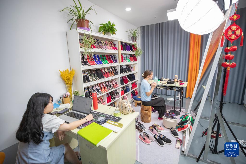 2022年8月20日,在重庆市巫溪县文峰镇农民工返乡创业园,重庆何航鞋业有限公司的主播们在向直播间粉丝们推介各色布鞋。新华社记者 黄伟 摄