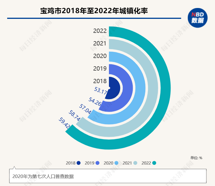 不过,比较明显的一点是,宝鸡城市化率逐年在提高。2018年至2022年,宝鸡的城镇化率分别为53.17%、54.26%、57.04%、58.74%、59.42%,人口加速流向城镇和城市核心区域的趋势明显增强。