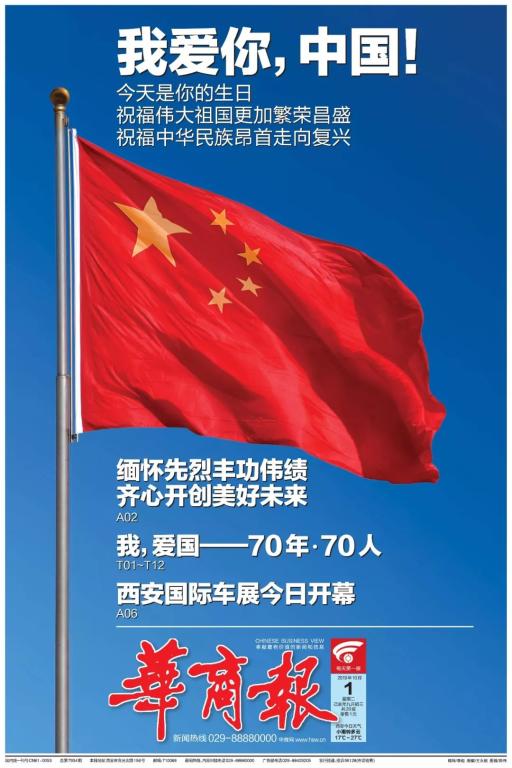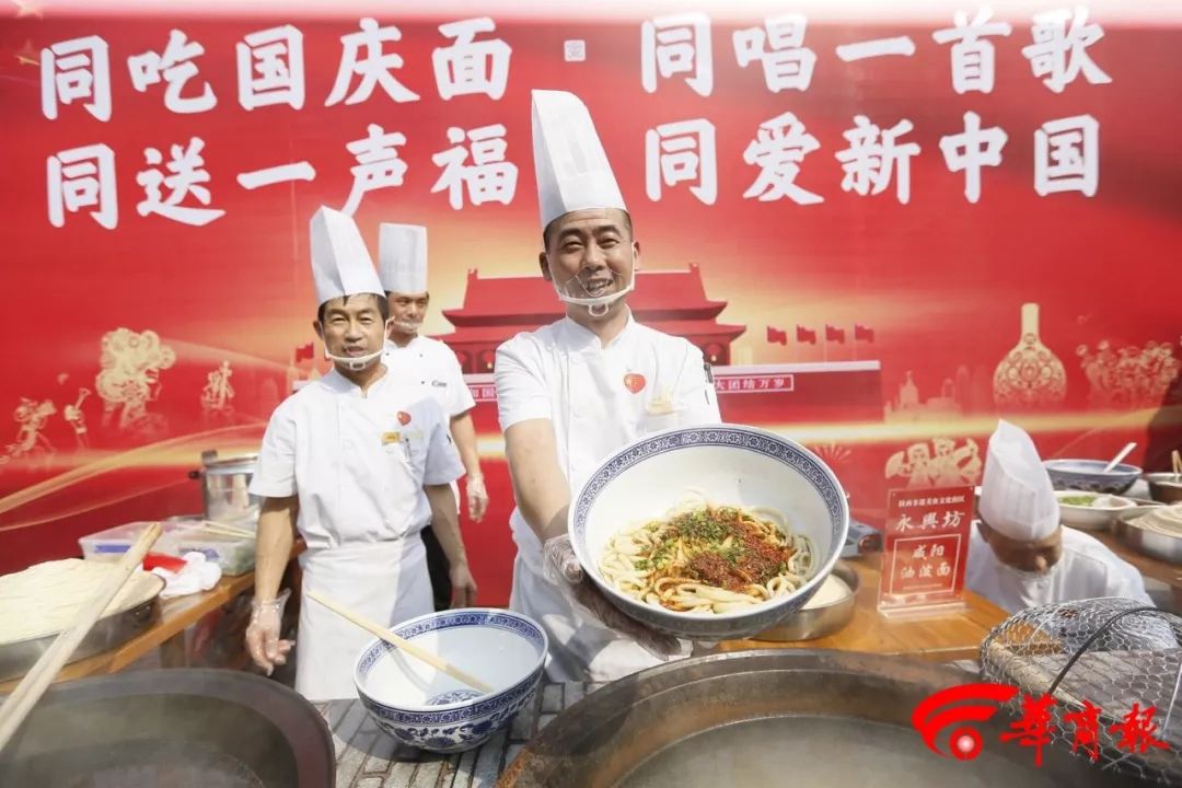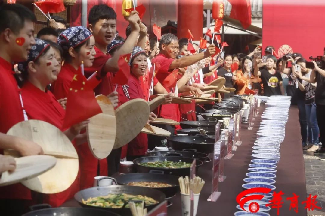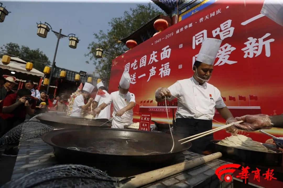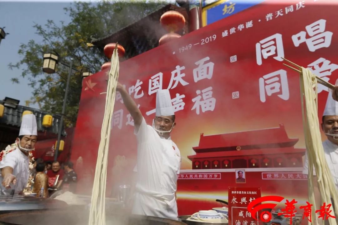 ▪ 为庆祝中华人民共和国成立70周年,9月30日上午,西安永兴坊非遗美食文化街区特举办“同吃国庆面、同唱一首歌、同送一声福、同爱新中国”活动,倡导国庆新民俗,让国庆假期成为人们的爱国周。永兴坊三大主楼厨师长亲自“操刀”,现场制作70米长的国庆面,寓意新中国成立70周年走过的风雨历程。