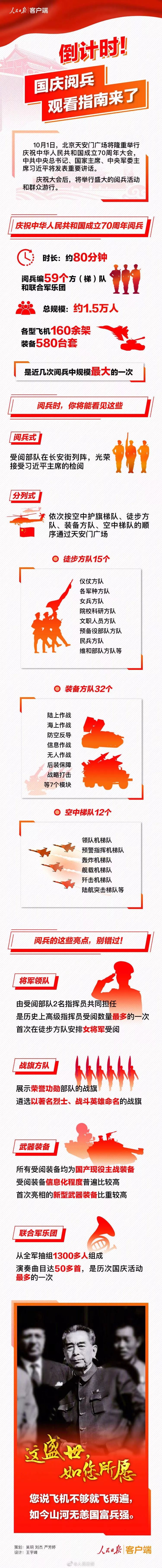 ▪今天,北京天安门广场将隆重举行庆祝中华人民共和国成立70周年大会。国庆阅兵观看指南来了!