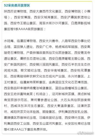 ▪ 今年国庆长假期间,西安市将结合“秋染中国·赏西安”旅游主题,推出“欢度国庆景区钜惠畅游西安”系列优惠旅游活动。其中,陕西历史博物馆、西安大唐西市文化景区、西安博物院(小雁塔)、西安汉城湖景区、西安市王顺山景区等9家AAAA级旅游景区和水陆庵、临潼区博物馆、蓝田猿人遗址、西安广仁寺等43家AAA以下景区免费开放。