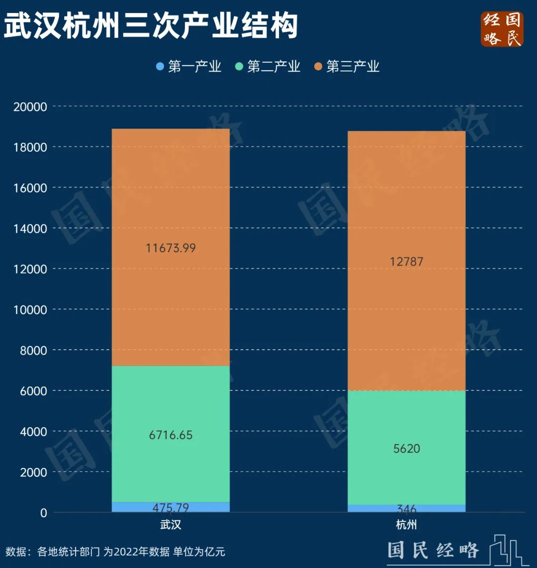 从三次产业结构来看, 武汉第二产业占比达35.6%,而杭州第二产业占比为30%,工业成了发展的最大短板之一。