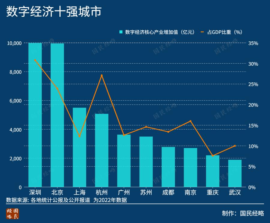 与之对比,武汉数字经济虽然发展不慢,但并非最大的优势产业。2022年,武汉数字经济核心产业增加值达到1909亿元,占地区生产总值比重超过10%。
