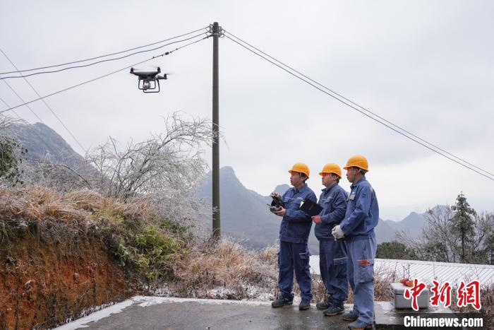 1月23日,南方电网广东清远阳山供电局阳城供电所工作人员采取“人巡+机巡”模式,观察、记录供电线路和配电设备的覆冰情况。(广东电网公司供图)