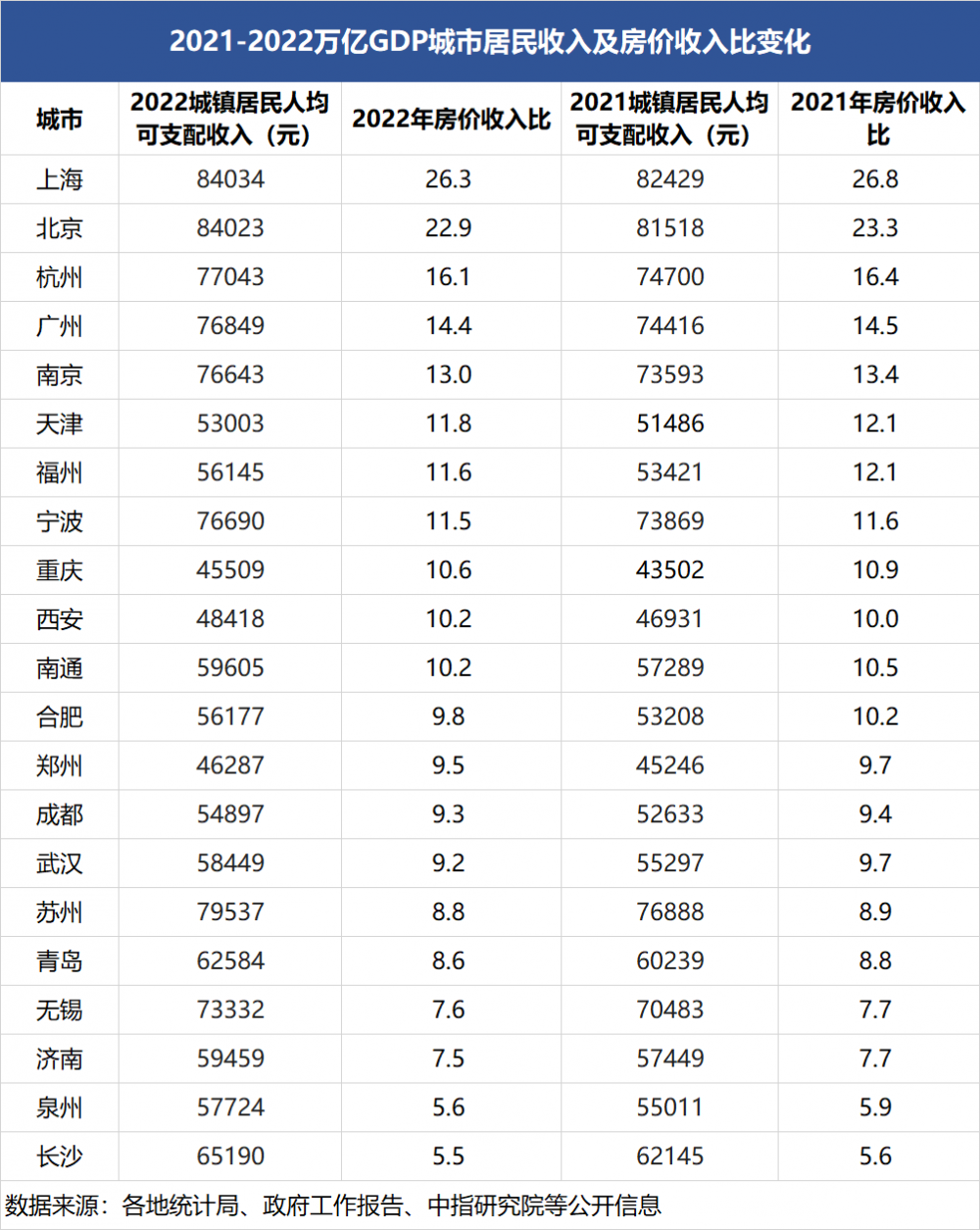我国城市众多,重点城市的房地产市场代表性更强、居民购房压力相对大。因此,21世纪经济报道将视线进一步聚焦到上海、北京、杭州、广州、南京、天津、福州、宁波、重庆、西安、南通、合肥、郑州、成都、武汉、苏州、青岛、无锡、济南、泉州、长沙、深圳、佛山和东莞这24个万亿GDP城市(截止到发稿,深圳、佛山和东莞尚未发布2022年城镇居民收入数据,主要统计其他21个城市)。