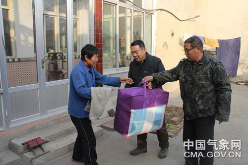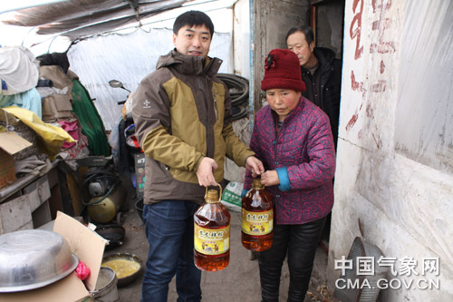 气象职工为结对帮扶贫困户送上棉被、米面油等慰问品。赵磊 摄影