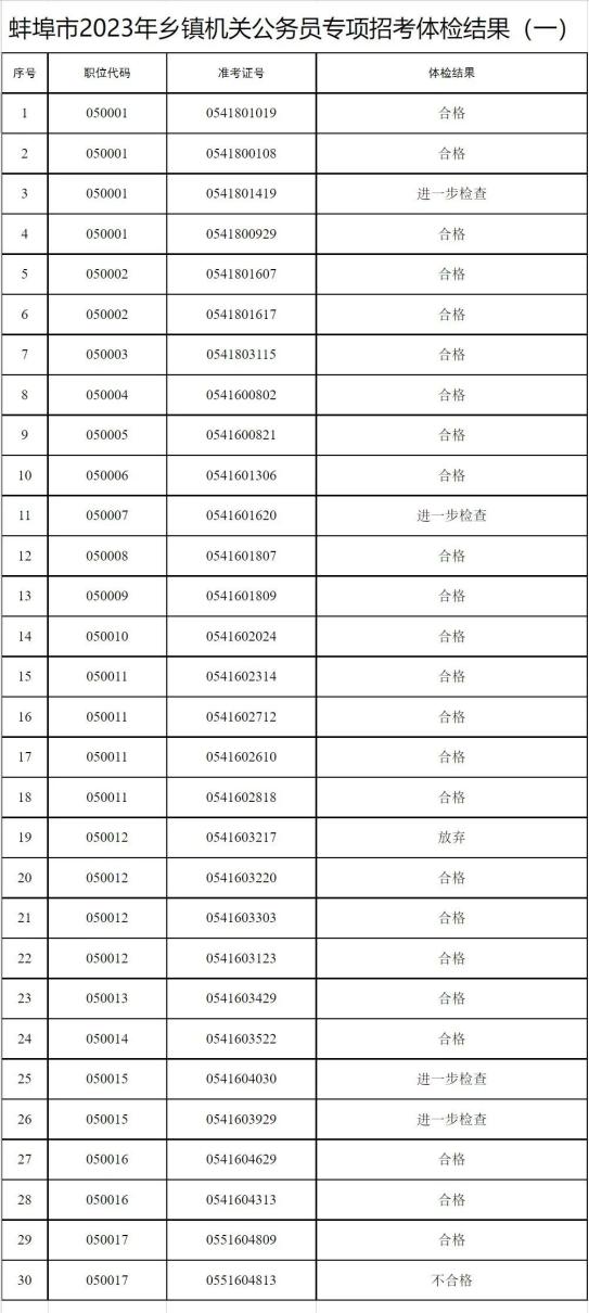 根据安徽省2023年乡镇机关公务员专项招考有关文件规定,现将蚌埠市2023年乡镇机关公务员专项招考11月4日体检结果进行公布。体检合格的考生进入考察程序,相关事项由考察单位通知。请进一步检查的考生于11月13日上午7:30前在蚌埠市第一人民医院体检中心集合(空腹),并按规定和要求参加体检。请考生保持电话畅通。