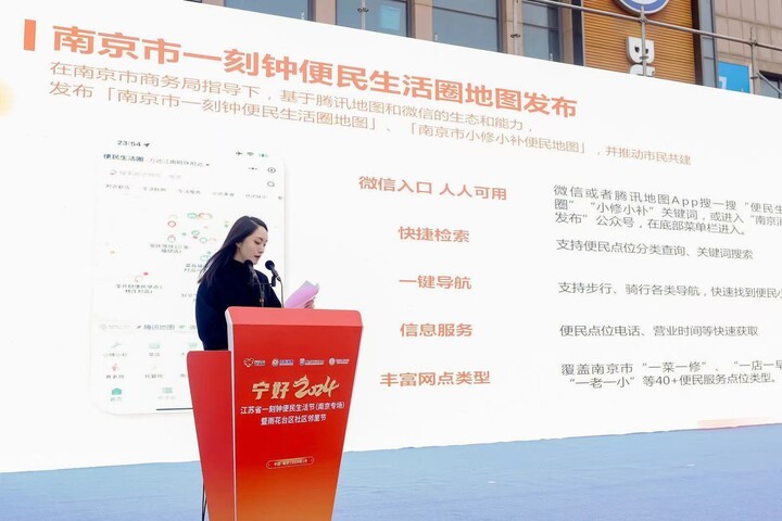 交汇点讯 2024年1月20日,在江苏省一刻钟便民生活节启动仪式上,由南京市商务局指导,腾讯地图和微信联合推出的“南京市一刻钟便民生活圈地图”“南京市小修小补便民地图”正式面向南京市民、商户上线,腾讯将以南京市作为“一刻钟便民生活圈地图”的首个核心试点城市,推动便民地图城市共建,助力打造便民地图城市标杆。