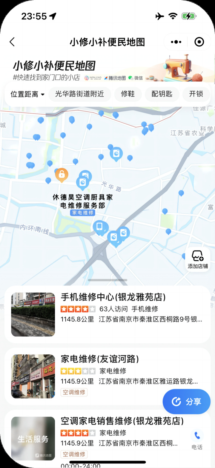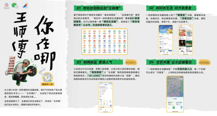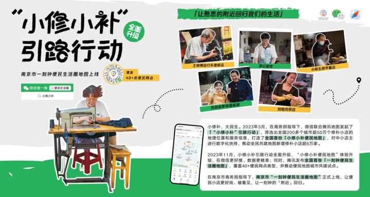 2023年2月,腾讯发起小修小补引路行动,发布全国首张小修小补便民地图,11月,升级行动并发布全国首张一刻钟便民生活圈地图,并开始推进便民地图的城市试点共建。以此次南京市便民生活圈地图发布为起点,微信和腾讯地图未来将联合更多市民、小店以及合作方共同参与到城市便民生活圈地图的共建中,也将为小店提供更多数字化权益,并从南京试点拓展至全国其他城市,一同修补我们的附近,共建我们的“方圆800米”。