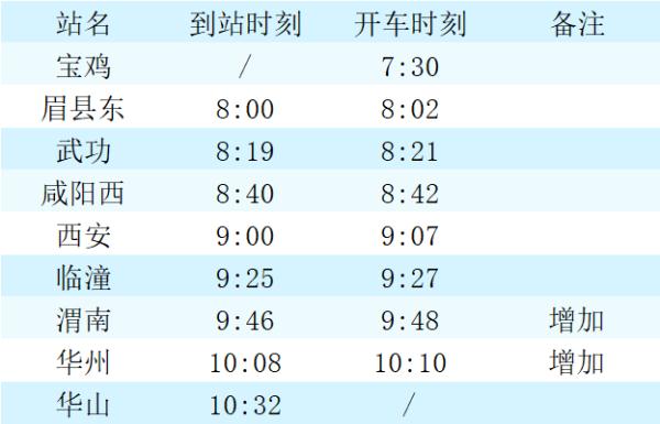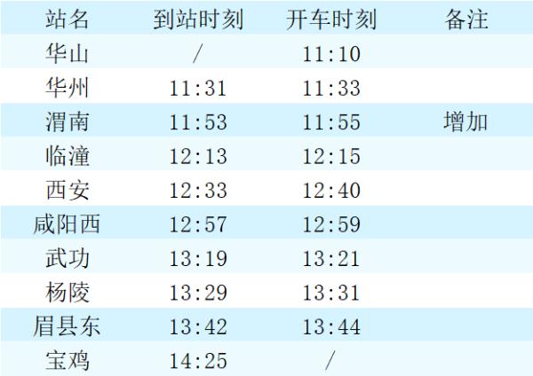 自2022年4月28日至5月10日,宝鸡~潼关C162/1次运行区段临时调整为宝鸡~华山,停站时刻调整如下:
