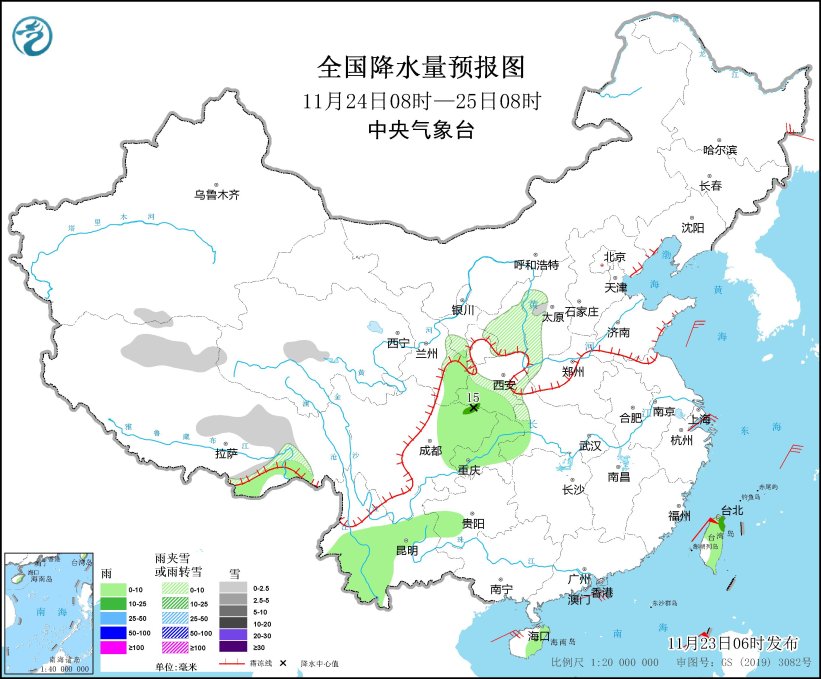 11月24日08时至25日08时,西藏北部和东部、青海中部、甘肃东部、宁夏南部、陕西中北部、山西西部、湖北西北部等地部分地区有小雪或雨夹雪。西藏东南部、甘肃东南部、陕西南部、四川东北部、重庆大部、湖北西部、贵州西南部、云南中部和西南部、台湾岛等地部分地区有小到中雨(10~15毫米)。内蒙古中东部、东北地区、山东和江苏东部、新疆南疆盆地、青海西部、甘肃西北部及西藏西部等地有5~6级、阵风7~8级的大风,局地阵风可达9级;黄海中部、东海大部、台湾海峡、台湾以东洋面、巴士海峡、南海北部和中部、南海西南部部分海域将有7~8级、阵风9级的大风,其中台湾海峡的风力可达9级、阵风10级(见图6)。