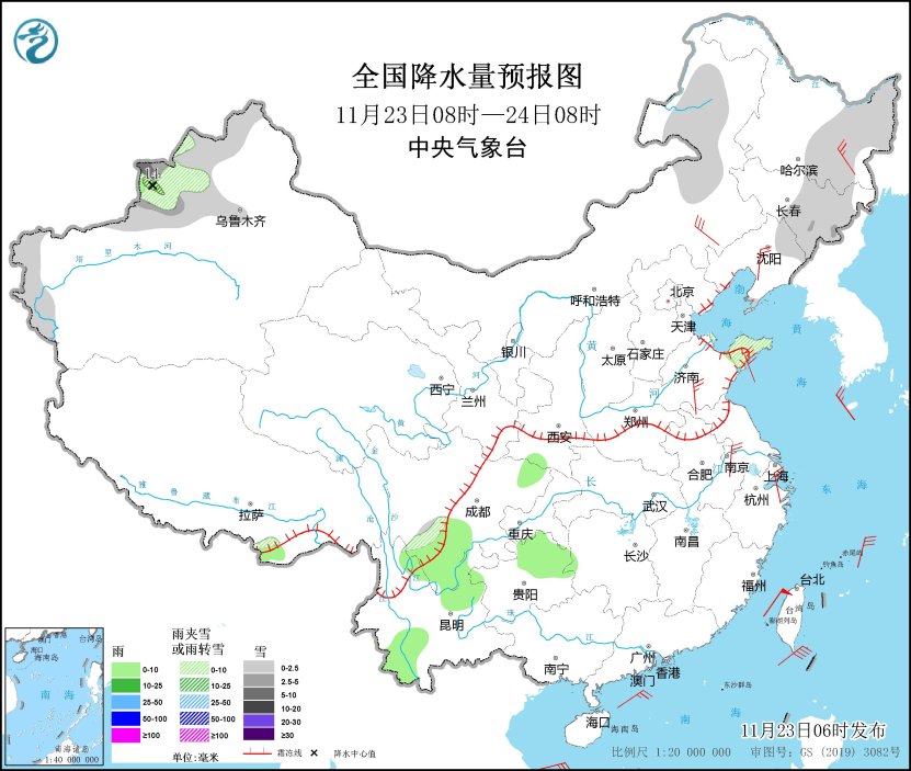 11月23日08时至24日08时,内蒙古东北部、黑龙江中东部、吉林中东部、新疆北疆西部和伊犁河谷、南疆西部高海拔地区以及山东半岛北部等地部分地区有小到中雪或雨夹雪,其中,新疆伊犁河谷局地有大雪。陕西南部、四川盆地东北部和南部、贵州中北部、云南东北部和西南部等地部分地区有小雨。内蒙古中东部、东北地区西部、华北东部、山东、新疆北部和南疆盆地东南部、甘肃西部、青海西部、西藏西北部等地有5~6级、阵风7~8级的大风,局地阵风可达9级;渤海、渤海海峡、黄海大部、东海大部、台湾海峡、巴士海峡、南海东北部、中东部和西南部等部分地区将有7~8级、阵风9级的大风(见图5)。
