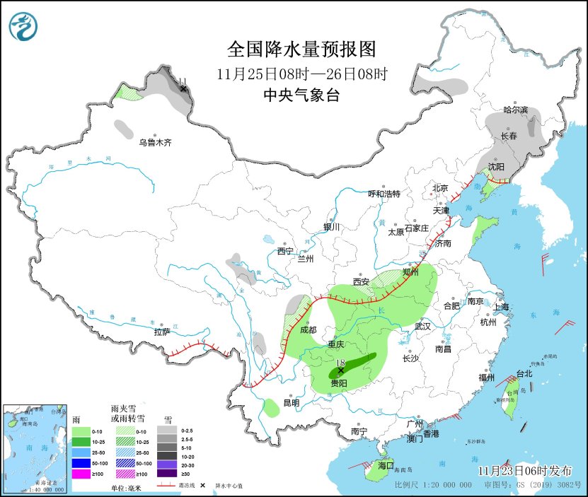 11月25日08时至26日08时,新疆北疆北部、内蒙古东北部、黑龙江南部、吉林中部、辽宁中北部、青海南部、陕西中南部、河南西部、川西高原等地部分地区有小雪或雨夹雪,其中,吉林中东部、新疆北疆北部等地部分地区有中到大雪,局地暴雪(10~11毫米)。陕西南部、河南大部、湖北大部、湖南西部、四川盆地西南部、贵州大部、海南岛、台湾岛大部等地部分地区有小到中雨(10~18毫米)(见图7)。