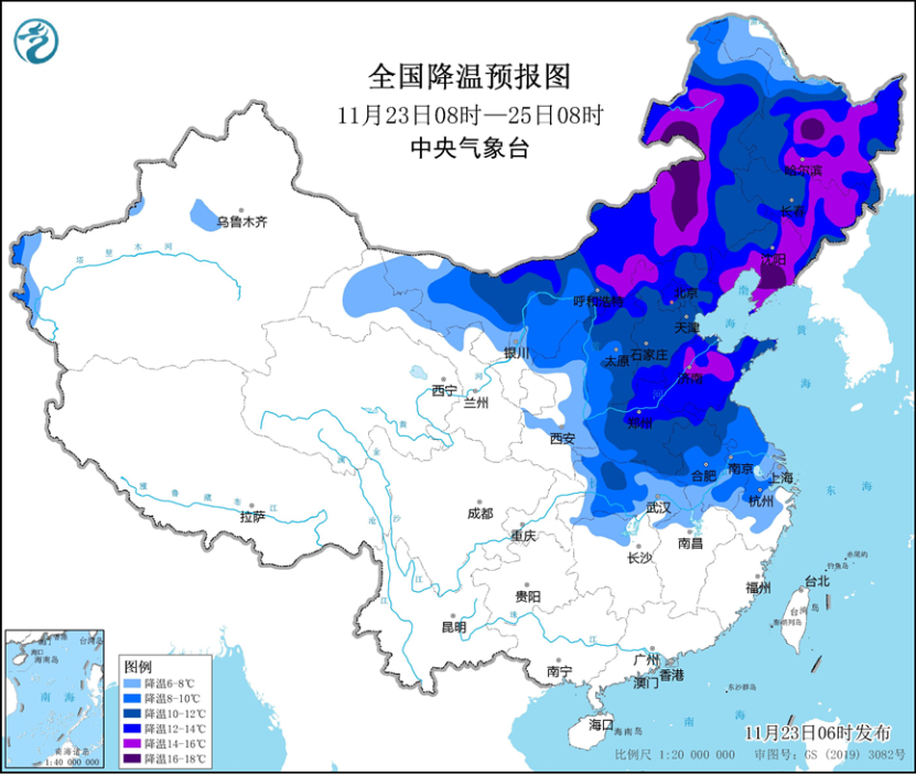 受寒潮影响,预计,11月23日08时至11月25日08时,甘肃西部、宁夏中北部、陕西中东部、内蒙古、华北、东北地区、黄淮、江淮、江汉、江南北部等地将先后降温6~10℃,其中,内蒙古中东部、东北地区、河北北部、北京北部和西部、山东、河南东部、安徽北部、江苏北部等地降温12~16℃,黑龙江中部、辽宁东部等地局地降温超过18℃。24日早晨,最低气温0℃线将位于苏皖中部至河南中南部、陕西南部、甘肃东南部等地,内蒙古中东部和黑龙江大部最低气温将降至-20℃以下,局地可达-30℃以下;23日至24日,上述大部地区伴有4~6级偏北风,阵风7~8级,局地9级;23日至25日,我国东部和南部海区也将先后出现6~8级大风,阵风9~10级。中央气象台11月23日06时继续发布寒潮黄色预警(见图1、图2)和大风蓝色预警(见图3、图4)。