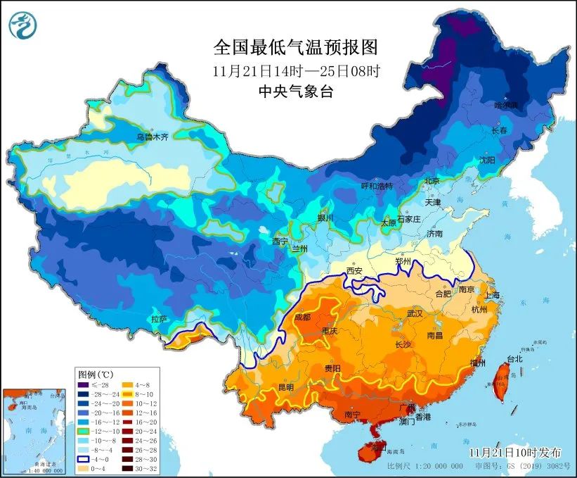 受寒潮影响,预计,今天至24日,长江中下游及以北地区气温将先后下降6~10℃,其中,内蒙古、东北地区、华北西部和北部、黄淮中东部等地降温12~16℃,内蒙古中东部、东北地区东部等地部分地区降温幅度可超过16℃,大风降温主要时段为22日至24日;寒潮影响后,最低气温0℃线将位于苏皖中北部至河南中南部、陕西南部、甘肃东南部等地,内蒙古中东部和黑龙江大部最低气温将降至-20℃以下,局地可达-30℃以下;上述大部地区伴有4~6级偏北风,阵风7~8级,局地9级;23日至25日,我国东部和南部海区也将先后出现6~8级大风,阵风9~10级。