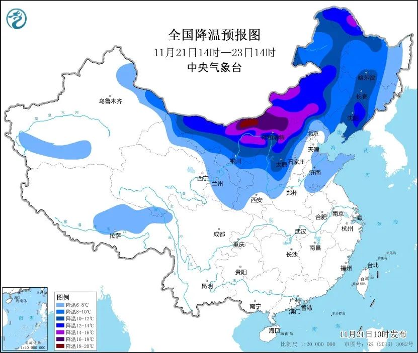 今日至23日14时,新疆东北部、西北地区中东部、内蒙古、东北地区、华北大部、黄淮东部等地气温将先后下降6~10℃,其中,内蒙古大部、黑龙江西北部、辽宁东北部等地降温12℃以上,内蒙古中西部偏北地区局地降温16~18℃。