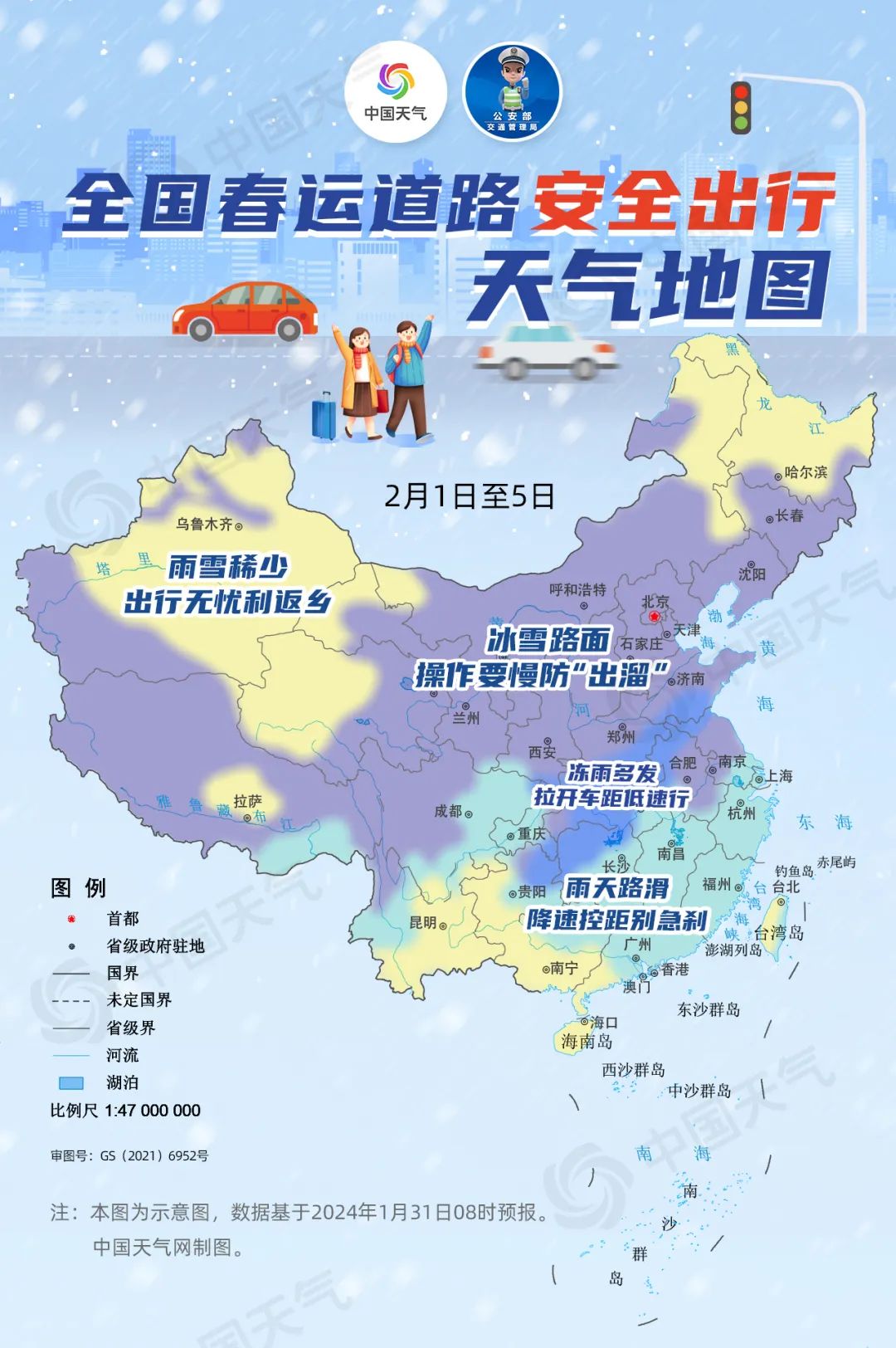 中国天气网联合公安部交通管理局提醒,春运期间自驾返乡、探亲、旅游出行的人员激增,本轮大范围雨雪天气过程正值春节前返乡出行高峰期,对春运影响较重,大家返乡时务必要注意行车安全。