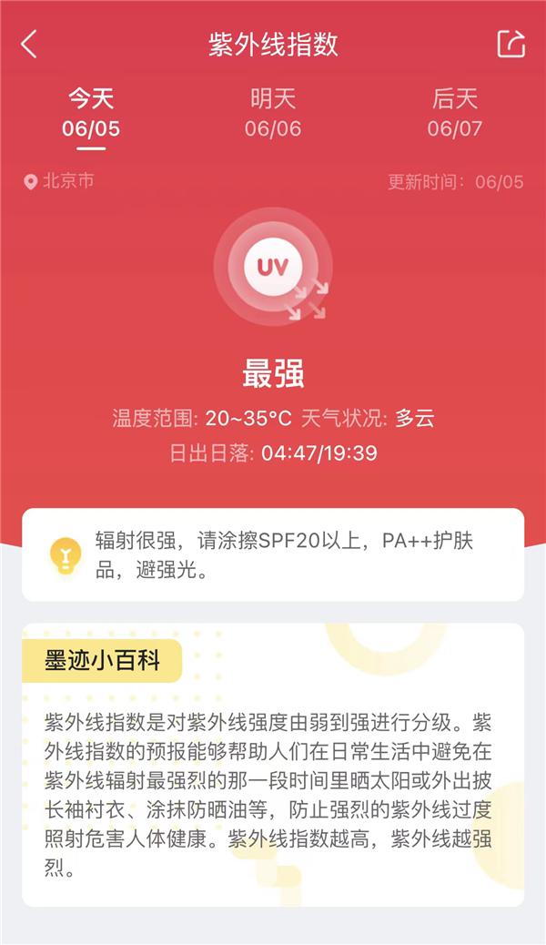 在等待期间,可选择避光通风的地方进行休息,同时可根据墨迹天气「紫外线指数」,按照提示建议做好防晒准备。紫外线指数强时,选择 SPF>15、PA+ 的防晒霜,再搭配防晒墨镜、遮阳伞或是长袖衬衫、防晒服等遮阳服饰,避免在紫外线最强烈的时间段晒太阳,防止强烈的紫外线过度照射危害人体健康,对皮肤造成损伤。