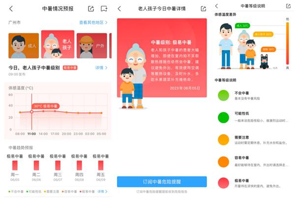 当环境气温过高、湿度大的时候,很容易发生中暑,出现头痛、头晕、恶心、呕吐等症状,严重的还会昏迷的危险。墨迹天气中暑预报,可以根据更易感知的体感温度,针对多种人群和场景提供逐三小时的中暑预警,来帮助用户做好中暑防范。用户还可以通过订阅,更及时获得准确的中暑危险提醒。家长在出门前,可以根据中暑趋势预报和建议采取相应的准备,及时为考生补充水份和盐份。