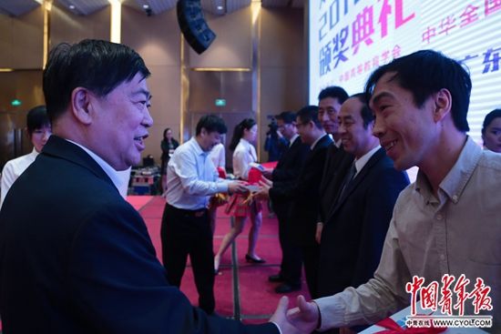 1月7日,广东省顺德,2016年学生喜爱的大学校长颁奖会,中国高等教育学会会长瞿振元等嘉宾向校长赠书。中国青年报·中青在线记者 赵迪/摄