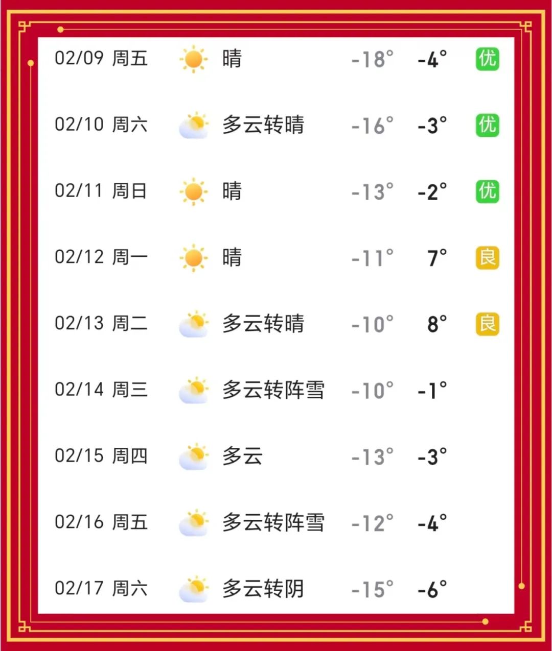 根据气象部门预测,“春节”假期期间我市气温正常,以多云天气为主。