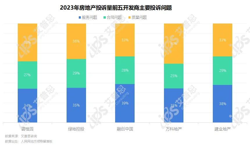 从投诉分类来看,2023年融创中国、建业地产服务问题相关投诉居多,占比分别为39%、38%;碧桂园、万科地产质量问题相关投诉较多,分别占比38%、41%。