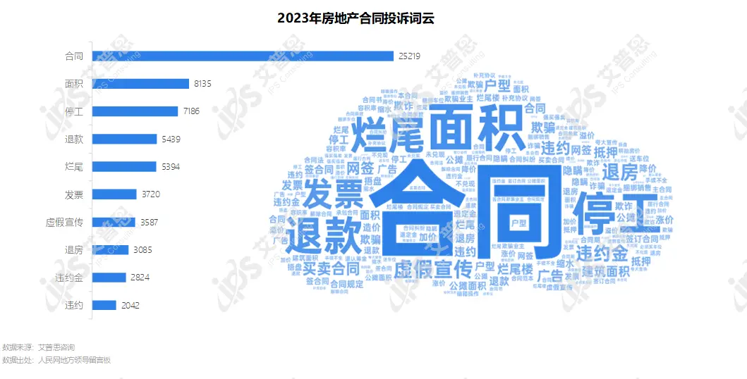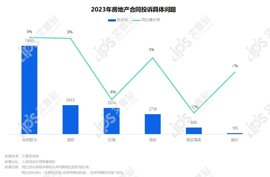 2023年,合同类投诉中合同欺诈投诉量11983起,较去年增长9%,主要涉及面积缩水、虚假宣传等问题;退款投诉3933起,较去年增长9%;烂尾投诉3574起,较去年下降8%。此外,强买强卖、降价相关投诉较去年均下降。