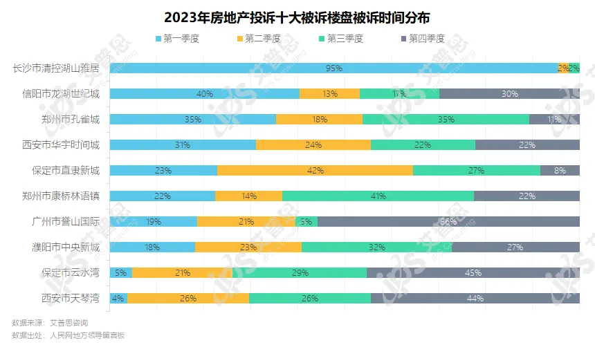 从被诉时间来看,长沙市清控湖山雅居收到的投诉主要集中在第一季度,另有部分楼盘因问题一直未得到解决,投诉从第一季度持续到第四季度,如信阳市龙湖世纪城、西安市华宇时间城、郑州市康桥林语镇、濮阳市中央新城、广州市誉山国际、郑州市孔雀城等。值得一提的是,郑州市孔雀城、郑州市康桥林语镇去年也在十大被诉楼盘之列,业主诉求一直未得到妥善解决。