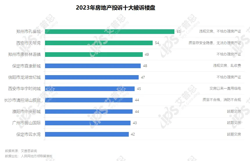 2023年被投诉最多的楼盘为郑州市孔雀城,共收到投诉65起,主要投诉问题为违规交房、不给办理房产证。