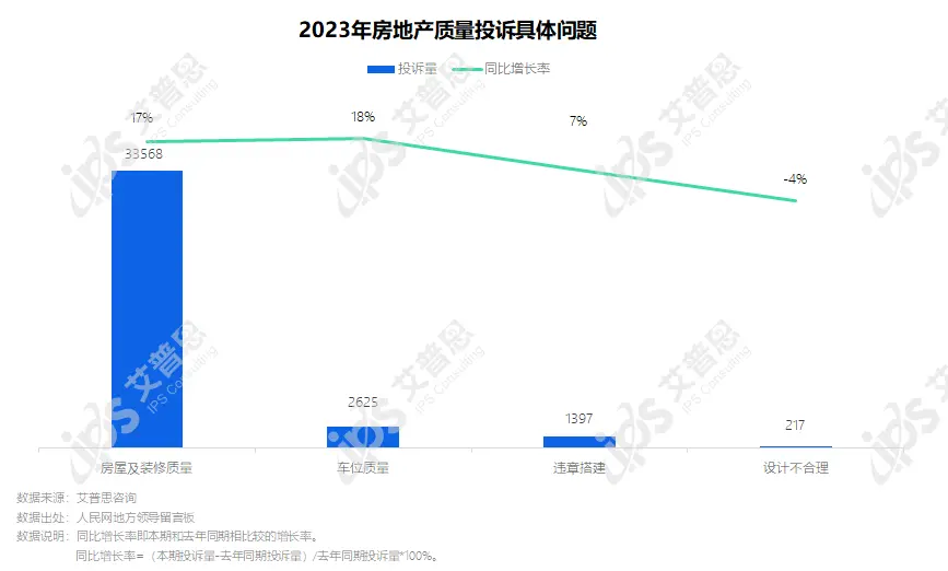2023年,质量投诉中房屋及装修质量相关投诉33568起,较去年增长17%;车位质量相关投诉2625起,较去年增长18%;违章搭建、设计不合理相关投诉分别为1397起、217起。
