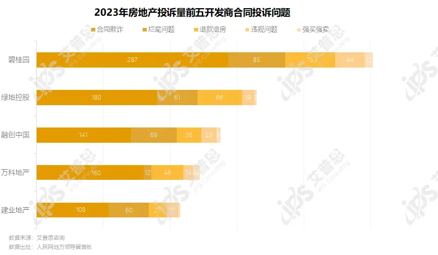 合同投诉方面,碧桂园、绿地控股被诉问题主要集中在合同欺诈、烂尾问题、退房退款;万科被诉问题主要集中在合同欺诈、退房退款,烂尾相关投诉较少;建业地产、融创中国被诉问题主要集中在合同欺诈、烂尾问题。