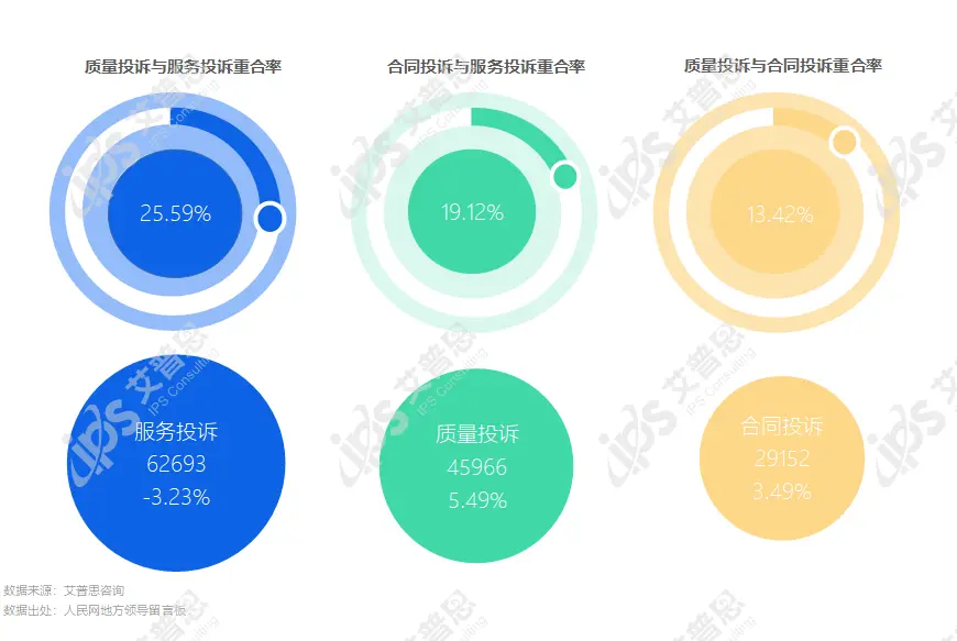 2023年,质量投诉与服务投诉重合率25.59%,较去年下降5.94%;合同投诉与服务投诉重合率19.12%,较去年增长2.53%;质量投诉与合同投诉重合率为13.42%,较去年增长8.50%。