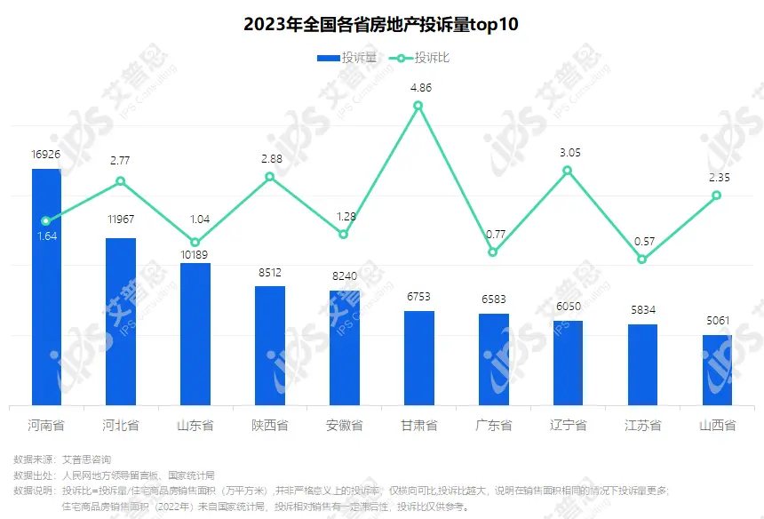 2023年房地产投诉地域分布:甘肃等四省投诉比偏高