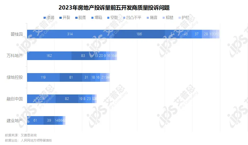 2023年,投诉量前五开发商质量投诉具体问题中,渗漏、开裂为主要问题,碧桂园收到渗漏相关投诉314起、开裂相关投诉186起,万科地产收到的渗漏、开裂相关投诉分别为162起、83起;绿地控股收到的渗漏、开裂相关投诉分别为119起、81起。