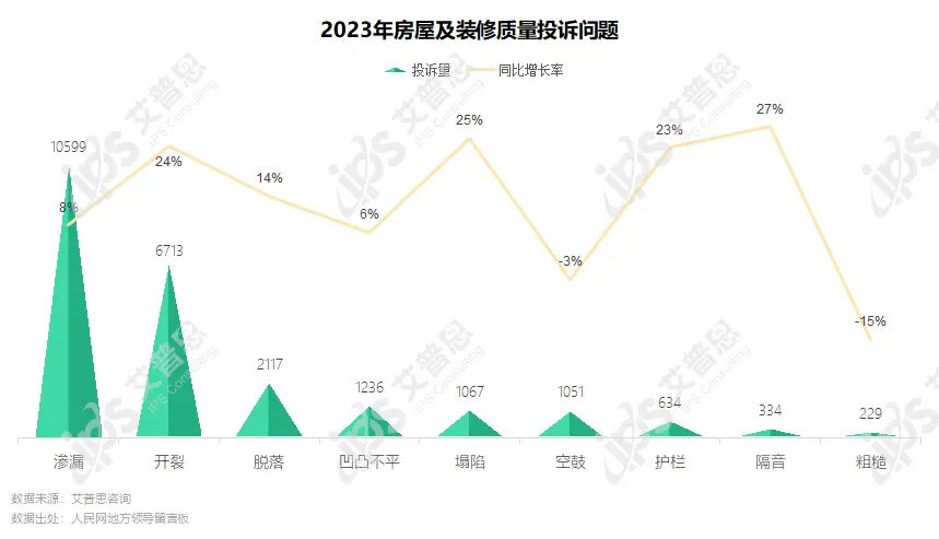 本年度房屋及装修质量投诉中主要问题为渗漏、开裂,相关投诉量分别为10599起、6713起,分别较去年增长8%、24%,塌陷、隔音相关投诉分别同比增长25%、27%。