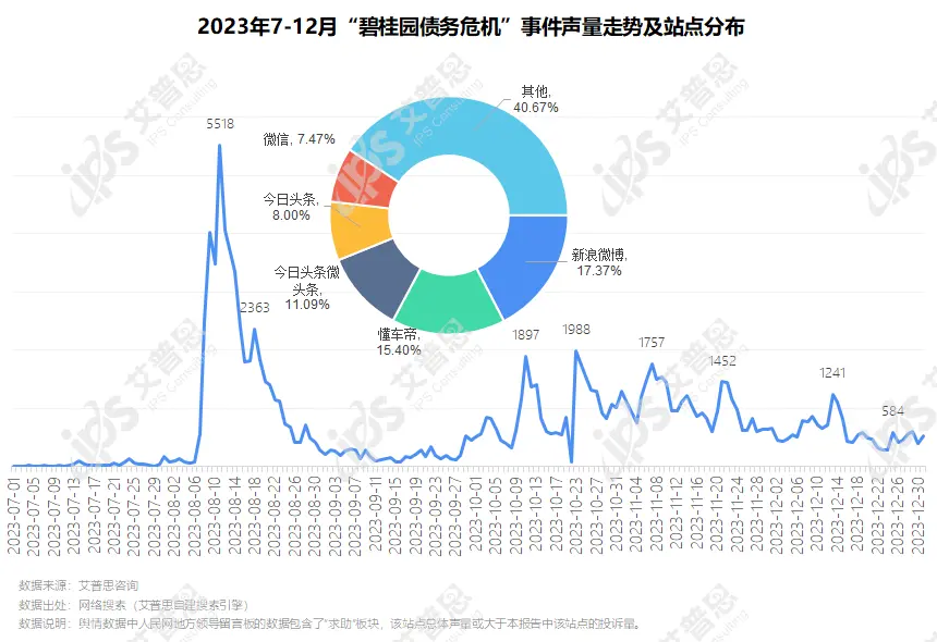 图2:2023年7-12月“碧桂园暴雷”事件声量走势及站点分布