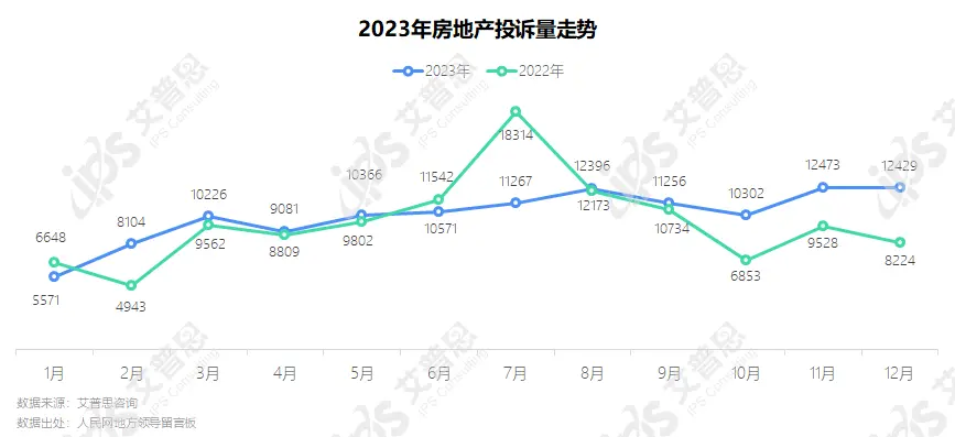 2023年,人民网地方领导留言板共收到房地产投诉约12.40万起,较去年增长5.90%。1-12月投诉量呈波动增长趋势, 11月、12月为投诉高峰。值得关注的行业事件有:碧桂园债务危机、富力地产被申请破产重整。