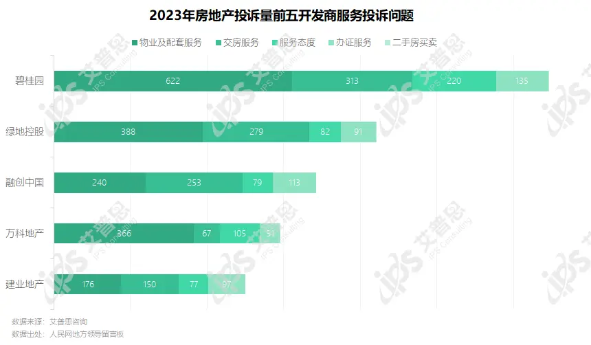 2023年,投诉量前五的开发商为碧桂园、绿地控股、融创中国、万科地产、建业地产,其中碧桂园投诉量较去年增长56%,绿地控股、融创中国投诉量较去年分别降低15%、9%。