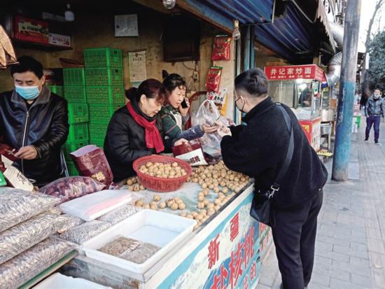 2月5日,在位于西安市建东街的陕西特产店,顾客正在选购核桃、大枣等特产。