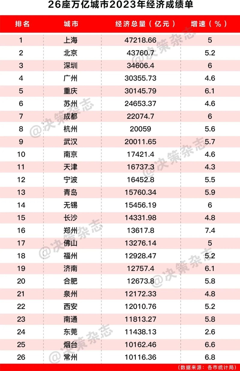 经过梳理发现,广州重返第四,与重庆携手迈过3万亿大关;杭州赶超武汉,共同跨过2万亿门槛;合肥跻身城市经济前20强;烟台、常州成功晋级“万亿俱乐部”。