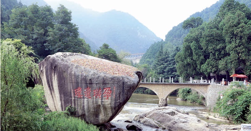 景区内,最著名、最传奇的当数矗立于伐鱼河河床的“丢石”了。“丢石”是一块巨大而完整的石英花岗岩体,高6.6米,上大下小,上部直径11.2米,下部直径仅4米,大有一触即倒之势,然而,千百年来,任凭河水冲刷,它始终稳如泰山。清乾隆五十九年(1794年),宝鸡知县徐文博在“丢石”上题写“孕璜遗璞”四个大字,寓意这块巨石中蕴藏美玉,也表达了对这块不明来历的巨石的美好遐想。此后,“孕璜遗璞”便成为宝鸡外八景之一。如今,在景区工作人员的精心保护下,“孕璜遗璞”古韵犹存,如同一颗镶嵌在青山绿水间的珍珠,吸引着天南海北的游客前来参观。
