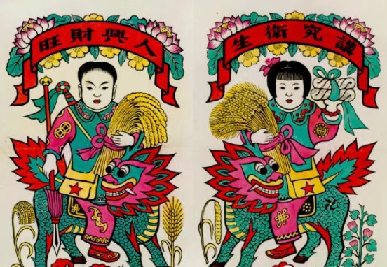 从天津杨柳青到苏州桃花坞,从开封的朱仙镇再到潍坊的杨家埠,中国传统年画盛行于大江南北。不同地区虽流派和风格迥异,但多围绕瑞禽祥兽、香草鲜花等充满吉祥寓意的主题展开创作,在春节张贴以祈福迎祥。随着形势的发展,延安新年画中的民间元素也多了起来,国人喜欢的兰花、牡丹、鲤鱼、灵兽等吉祥物逐步被融入到创作中。