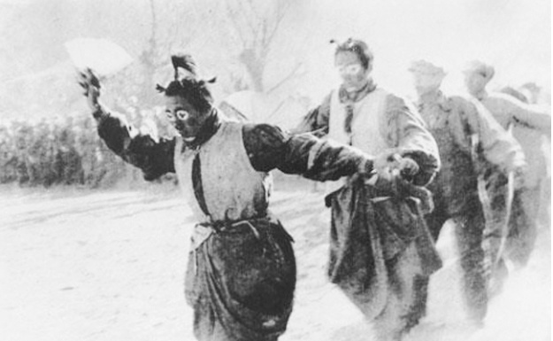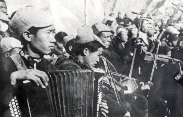 1943年鲁艺秧歌队在延安演出,排头者为刘炽。