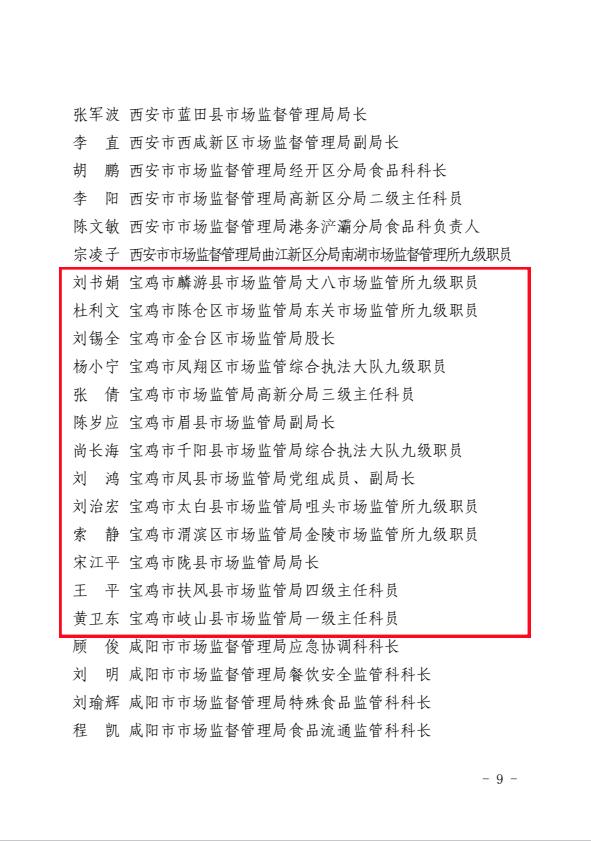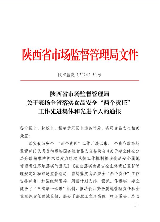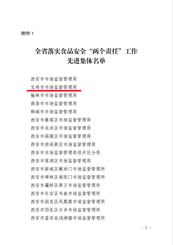 近日,陕西省市场监督管理局印发《关于表扬全省落实食品安全“两个责任”工作先进集体和先进个人的通报》,宝鸡市市场监管系统10个“先进集体”和13位“先进个人“在列。