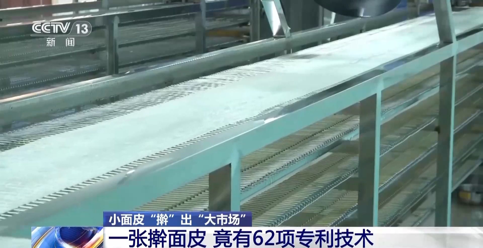 让记者没想到的是,这样一张小小的擀面皮,竟然有62项专利技术。从面皮制备、洗面沉淀、熟化成型到发酵口味等,这些专利涵盖面皮的整个工业化生产流程。这家企业的负责人给记者介绍了其中一项核心专利技术——擀面皮熟化技术。