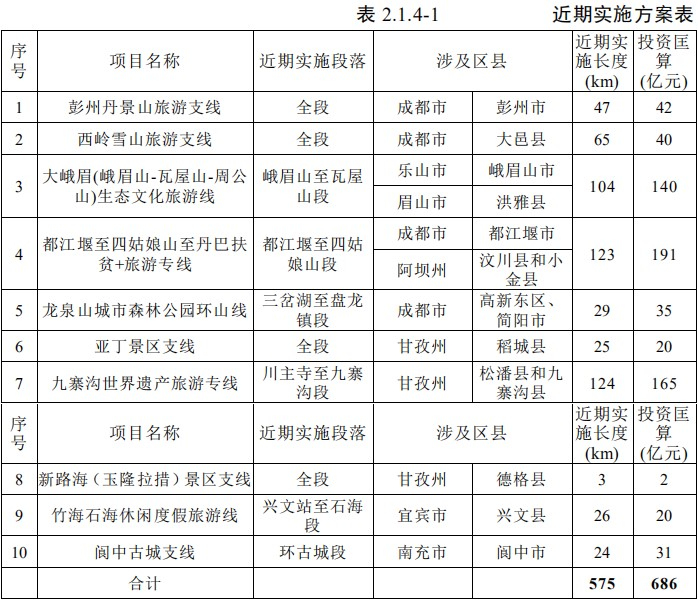 根据规划,四川省山地轨道交通将分两期建设,规划建设23条交通线,总里程数2520km,建设投资2180亿元,涉及区县118个,连接旅游资源26个。