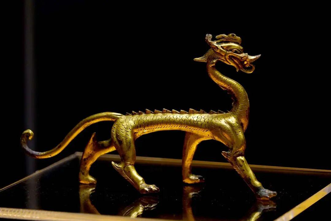 这是一条器宇轩昂的“小细龙”!背脊呈锯齿状,长尾拖后上卷,全身刻画鱼鳞纹,金灿灿的通体鎏金显得贵气十足!