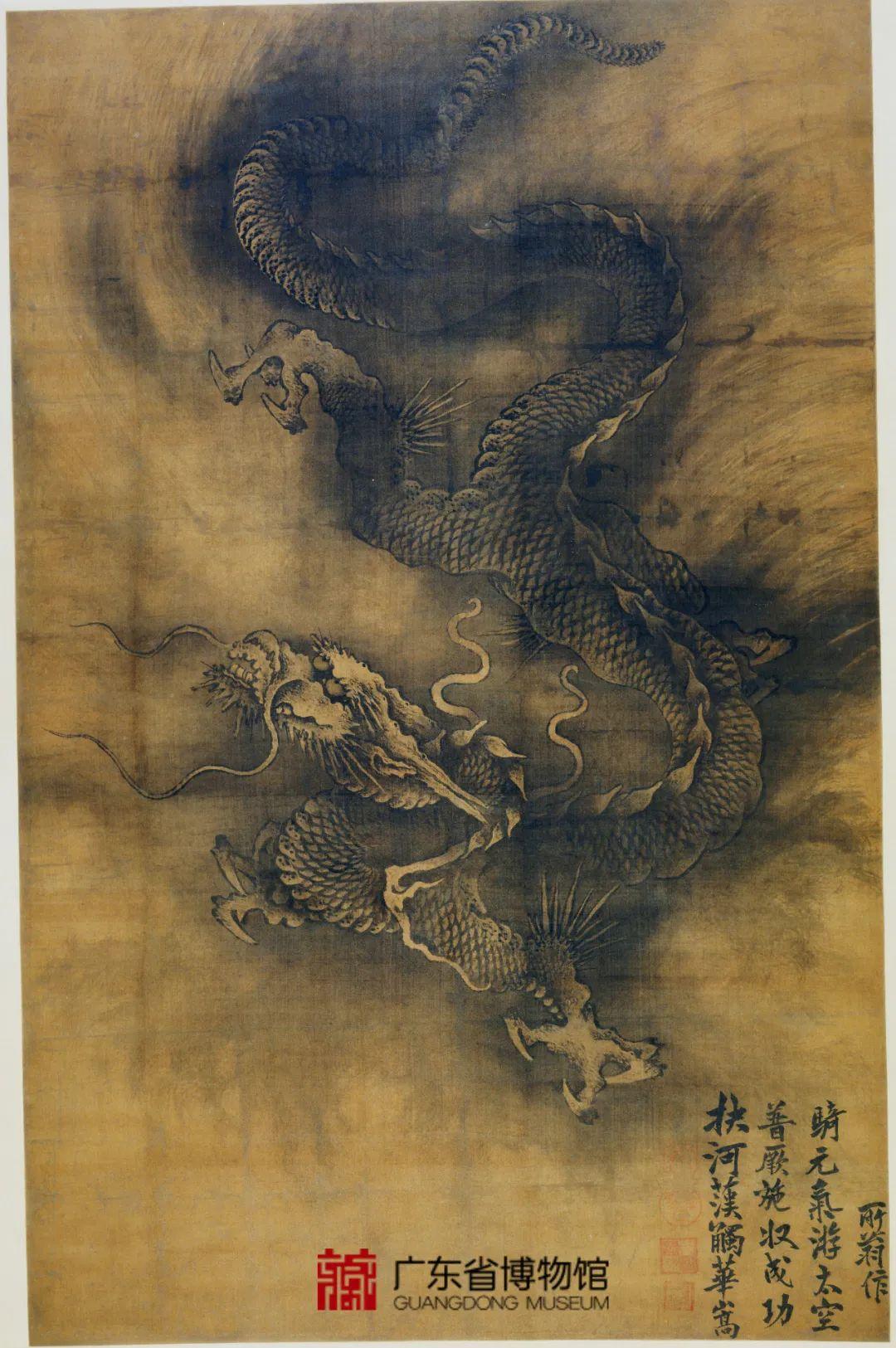 这是中国美术史上的画龙杰作,画家用粗劲的线条,勾画龙身并以淡墨晕染,仅在龙的眼睛及爪处施有赭色,画面右下“骑元气,游太空”等字样,与盘旋矫健、须目偾张的飞龙呼应,将飞龙腾跃九天、叱咤风云、势震山河的磅礴气势呈现得淋漓尽致。