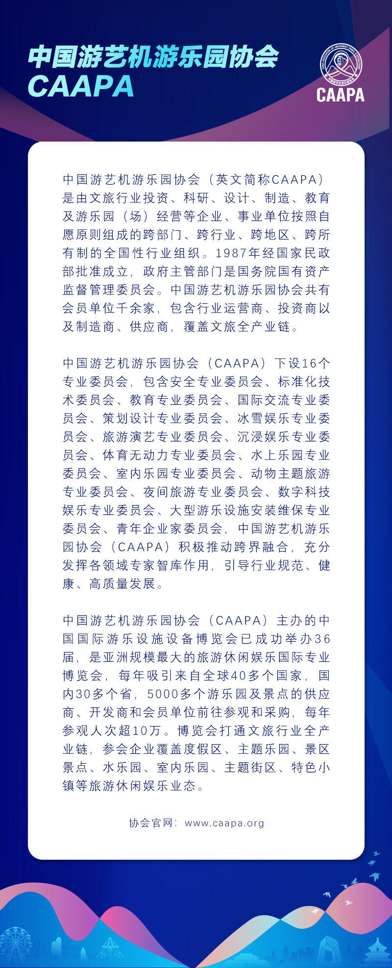 这里是中国游艺机游乐园协会(CAAPA)定期更新的会员资讯,如果您是CAAPA会员,欢迎您将企业资讯发送至CAAPA宣传部微信进行投稿。